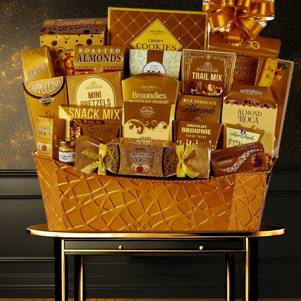 Description: 23 items: Lindt Lindor Assorted Truffles 36g, Laura Secord Fudge 20g, Brown & Haley Almond Roca Cookies 57g, Brown & Haley Cashew Roca 11g, Brown & Haley Almond Roca 33g, Truffettes de France 45g, Comfort Collection Caramel Popcorn 28g, Aunt Gloria's Sugar Cookies 120g, Sonia's Favourite Cookies 113g, Barista's Best Cappuccino 28g, Aunt Gloria's Choc Dipped Biscotti 42g, Comfort Collection Roasted Almonds 40g, Comfort Collection Tea (5 Bags), Snacktales Trail Mix 57g, Comfort Collection Biscotti 35g, Snacktales Mini Pretzels 57g, Aunt Gloria's Broundies Cookies 57g, Snacktales Choc Almonds 57g, Snacktales Snack Mix 57g, Guylian Belgian Truffles 22g, Snacktales Choc Brownie Fudge Thins 42g, Lost Acres Mustard 39g, Metal Basket (20''). GIFT BASKETS ARE DRESSED IN CELLO AND BOW*