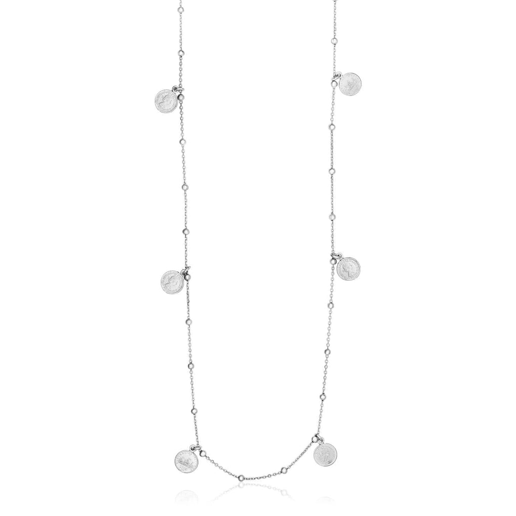 Timeless Roman coin charms punctuate the elegant long chain of this exquisite sterling silver necklace. Necklace is 24 inches long and closes with a lobster clasp.