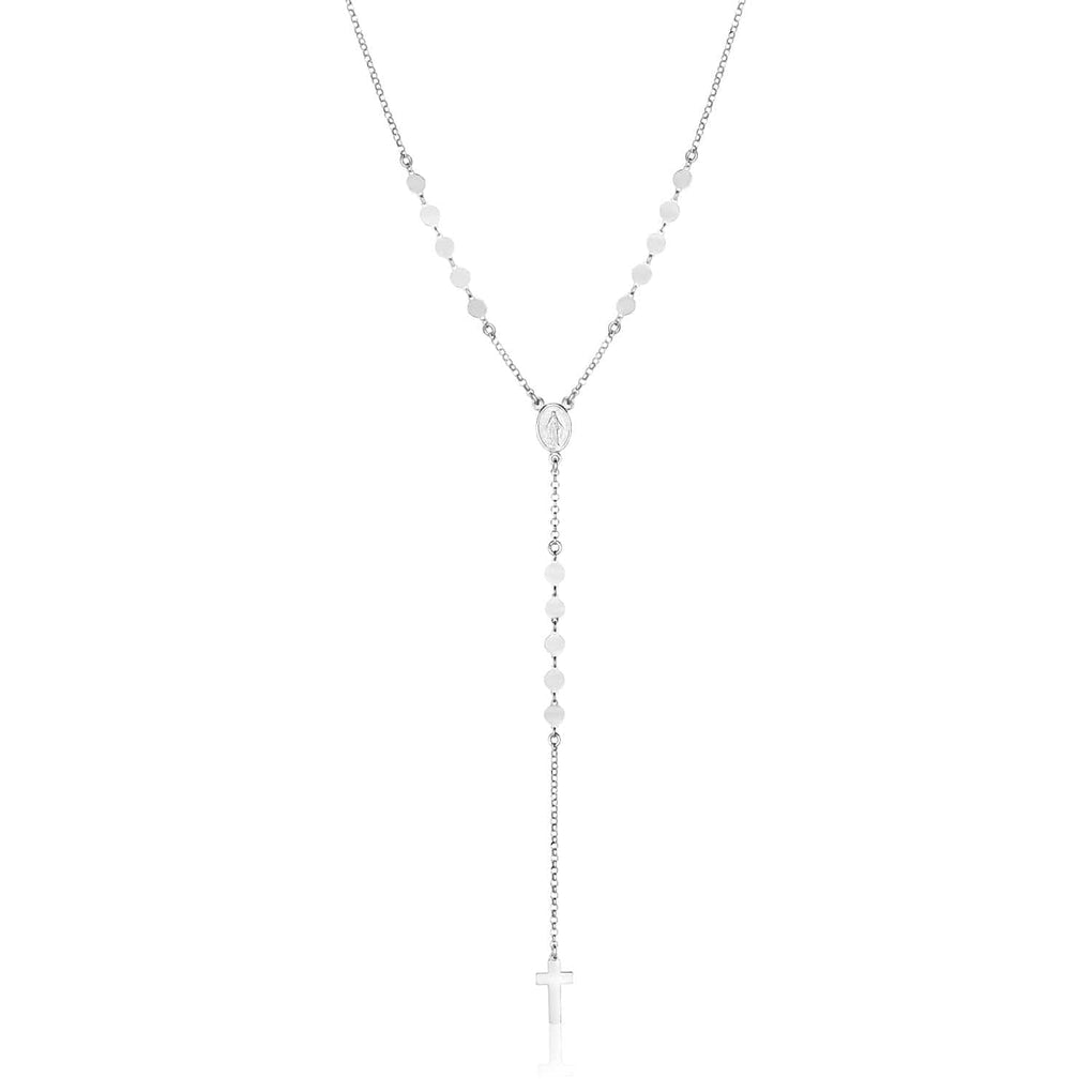 This beautiful expression of faith, inspired by a traditional rosary and created in sterling silver, is punctuated by polished circles, a cross, and a lovely religious medallion. Necklace is 24 inches long and closes with a lobster clasp.