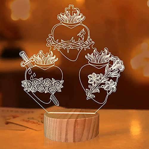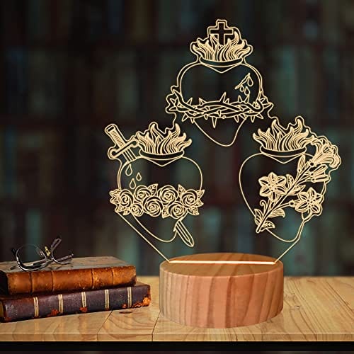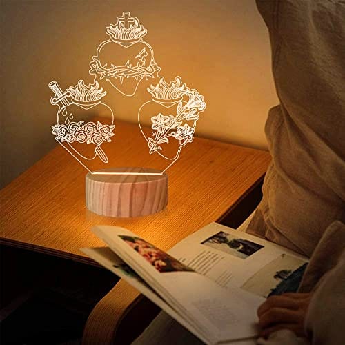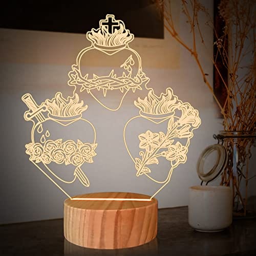 - ❤️ HIGH-QUALITY❤️ The 3D lamp base is made of high-quality pine wood materials, lightweight and robust, without a pungent smell, and without sharp edges. The three sacred heart night light is made by 3d laser engraved technology to create a 2D gorgeous optical amazing visual. In fact, it is a 2D acrylic plate with laser-engraved lines.