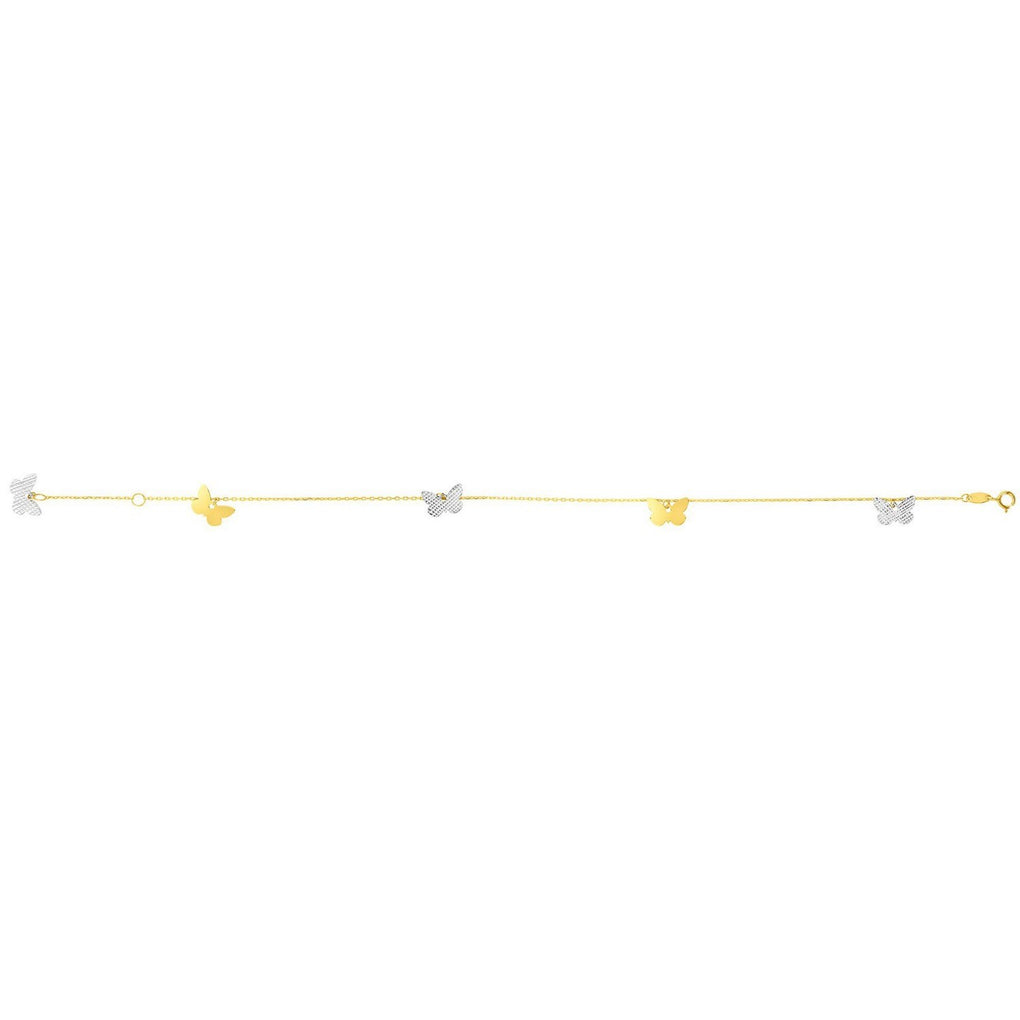 De joyeux papillons polis flotteront avec vous pendant que vous marchez avec cette cheville ludique et élégante en or bicolore 14 carats. Le bracelet de cheville mesure 10 pouces de long et se ferme avec un fermoir à anneau à ressort.