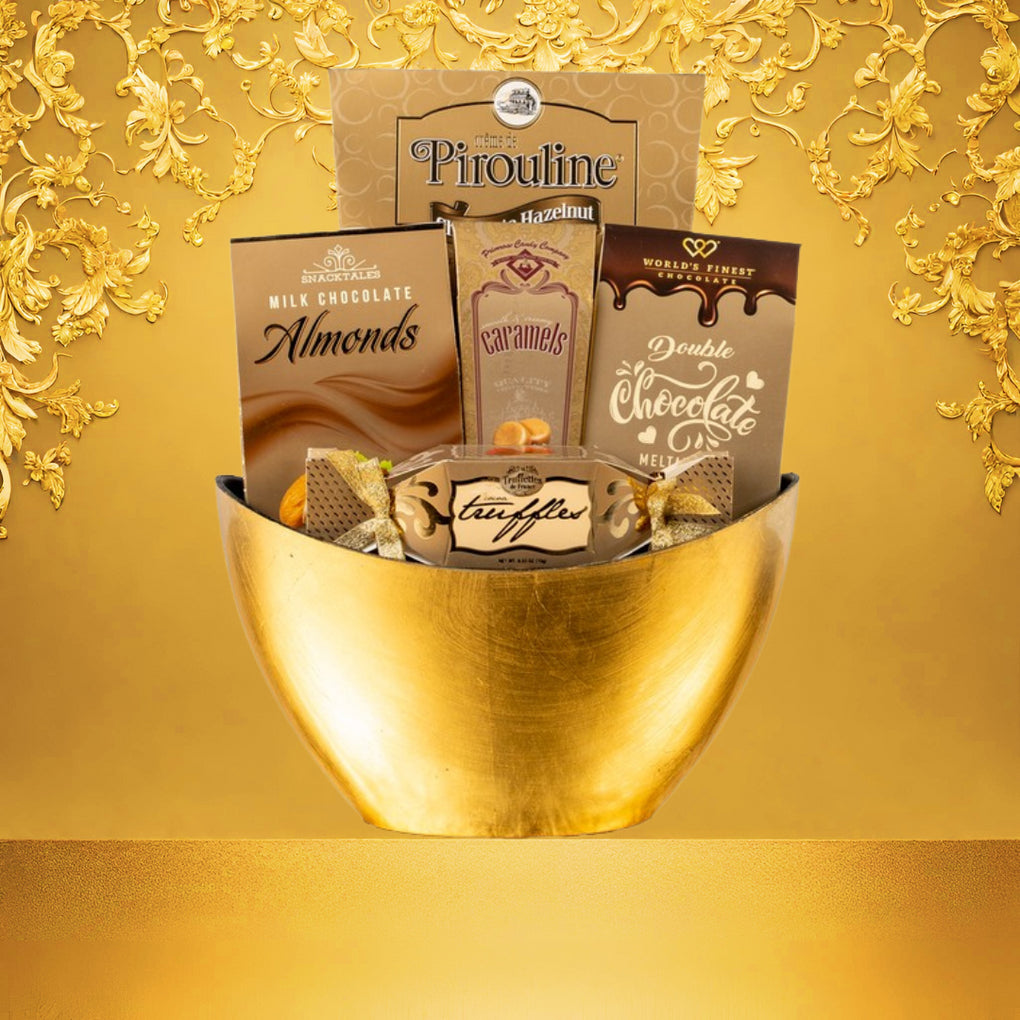 Ce panier-cadeau Golden Queen est le moyen idéal de se faire plaisir avec un luxueux mélange de chocolats, caramels, noix et gaufrettes. Savourez les meilleurs fondants double chocolat au monde, des gaufrettes crémeuses à la crème de noisettes, des truffettes de France, des amandes au chocolat au lait délicieusement noisettes et des caramels à l'onagre. Faites-vous plaisir ou faites plaisir à quelqu'un de spécial !