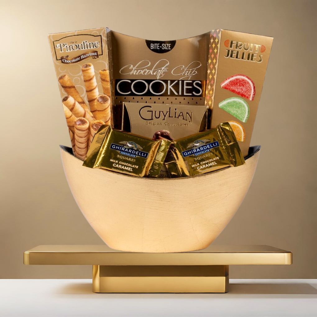 Offrez-vous une sélection luxueuse de friandises sucrées auxquelles vous ne pourrez pas résister ! Avec une grande variété de saveurs et de textures, cet élégant panier-cadeau séduira à coup sûr vos papilles.