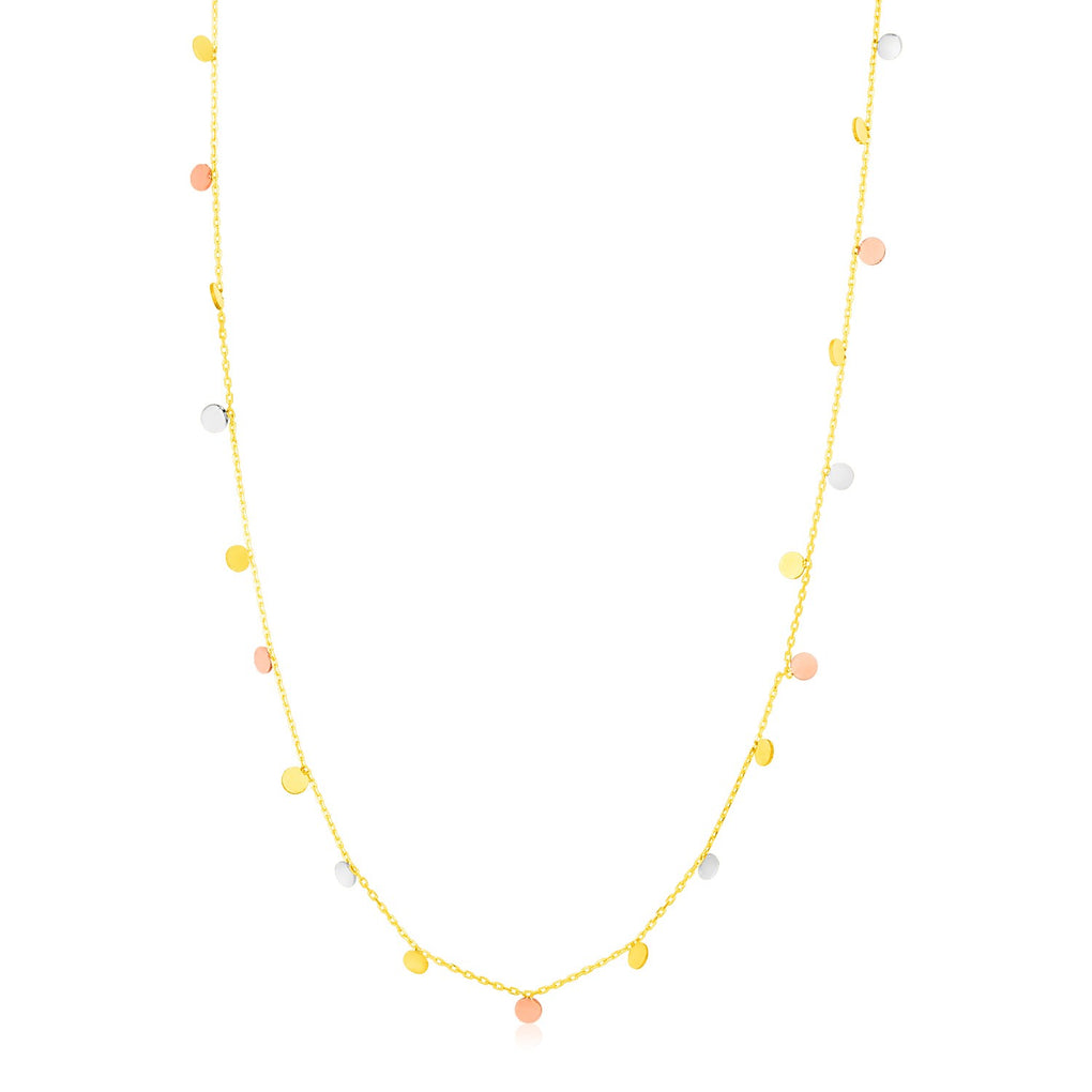 Twinkling circles in 14K yellow, white, and rose gold shimmer and swing from a simple chain to create this elegant necklace. Necklace is 18 inches long, 0.6mm wide, and closes with a spring ring clasp. Circle elements measure 3mm.