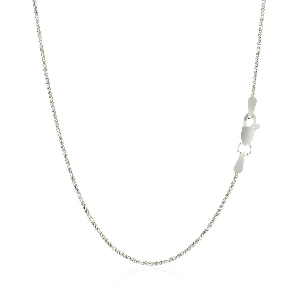 This round wheat chain comes in 14k white gold and has a width of 1.00 millimeters.