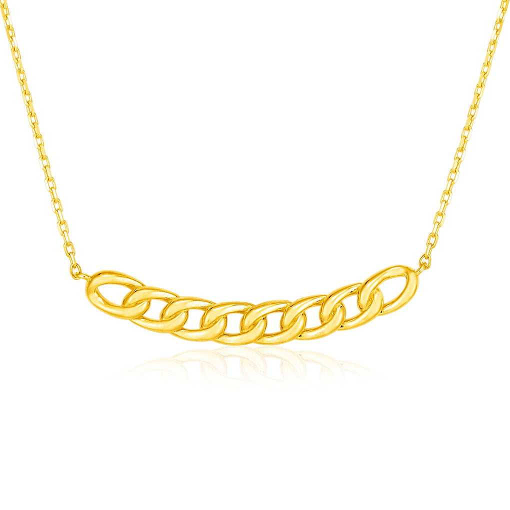A classic curve of polished links of chain decorates this versatile, unique 14k yellow gold necklace. Necklace is 18 inches long and closes with a lobster clasp.