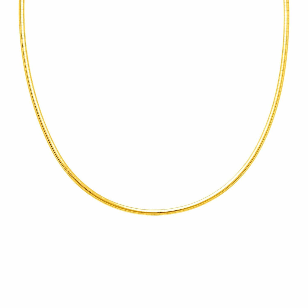 A sleek classic omega chain necklace crafted in yellow finish sterling silver. Available in 16 inches and 18 inches sizes and secured with a lobster lock.