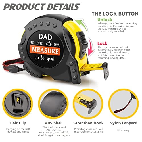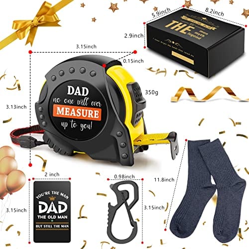 - 💗 Specific information: Gift box size: 7.8*5.9*3 inch. The bayonet of the heavy duty tape measure allows the ruler to retract steadily, and has the greatest durability. The unit of measure is inch and centimeter. It comes with a pair of free size cotton socks, a 8*5cm aluminum alloy wallet card with love reminder to dad, and a multi-function keychain can be used as a flat-blade screwdriver and beer bottle opener.