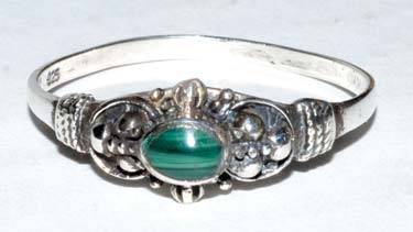 This rings delicate and finely detailed design draws the eye into its centered synthetic Malachite stone. Malachite will assist you with your heart, expanding your ability to love and drawing love to you, power, protection, love, peace, and business success. Designs run across ½” of this charming piece. Sterling Silver. Sizes may vary.