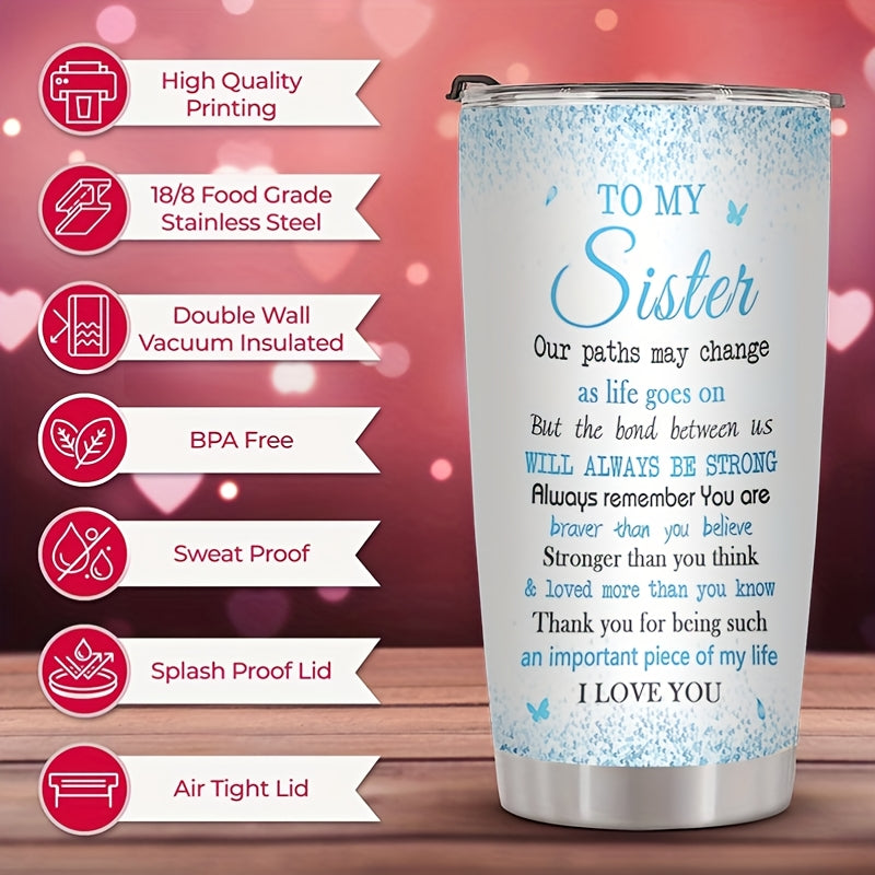 Celebrate the unparalleled bond shared with your sister by gifting her a unique, handpicked item that speaks volumes. Whether it's for her birthday, a special holiday, or just because, the Sister Gift Tumbler 20oz is the perfect embodiment of your love and admiration. Designed to resonate with both practicality and sentimentality, this tumbler is an unforgettable keepsake that will be cherished for years to come. Offering a blend of modern aesthetics and robust functionality, it stands as an emotional testament to the unbreakable sisterly bond, ideal for every occasion. Crafted with premium 304 Stainless Steel, this tumbler is not just a gift—it's a declaration of affection, promising to keep beverages at their optimal temperature while conveying a heartfelt message.