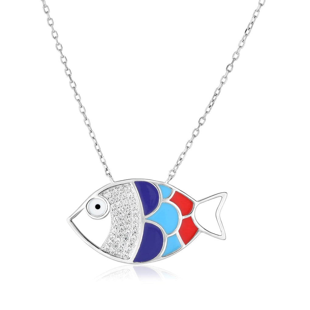 Sterling Silver 18 inch Necklace with Enameled Multicolored Fish