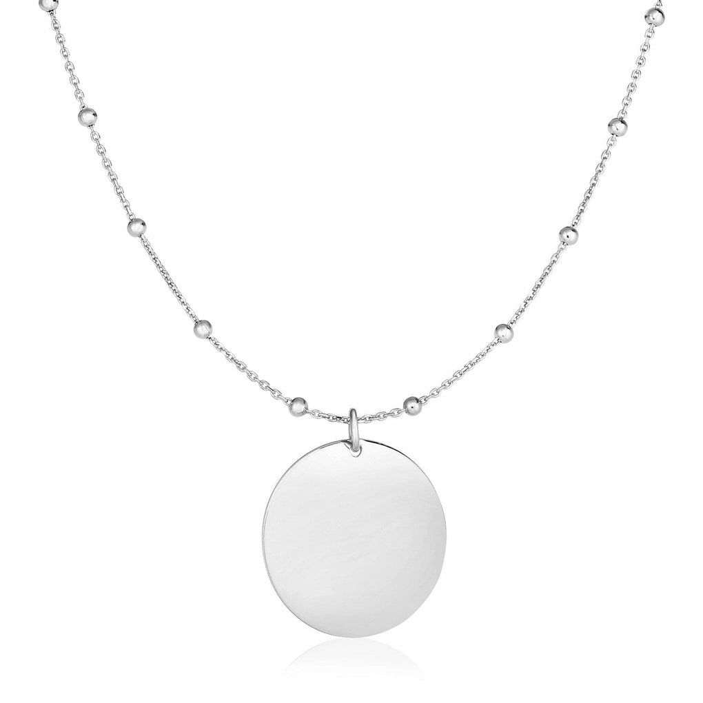 A simple, round and engravable pendant adorns a single strand of lovely chain punctuated by highly polished beads. Necklace is 18 inches long and closes with a lobster clasp.