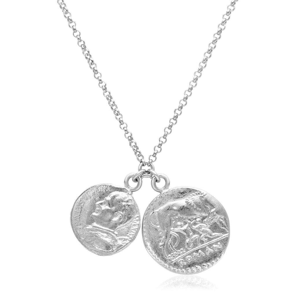 This classic sterling silver necklace features a pair of elegant Roman coin charms suspended from beautiful chain. Necklace is 20 inches long and closes with a lobster clasp.