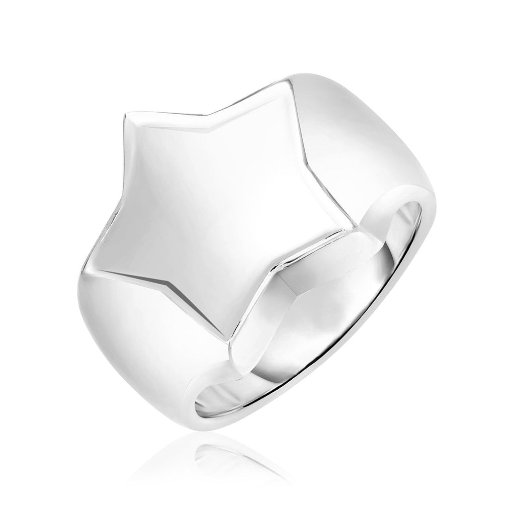 A spectacular star nestles on this bold, gorgeously polished sterling silver band. Ring sizes 7-8.