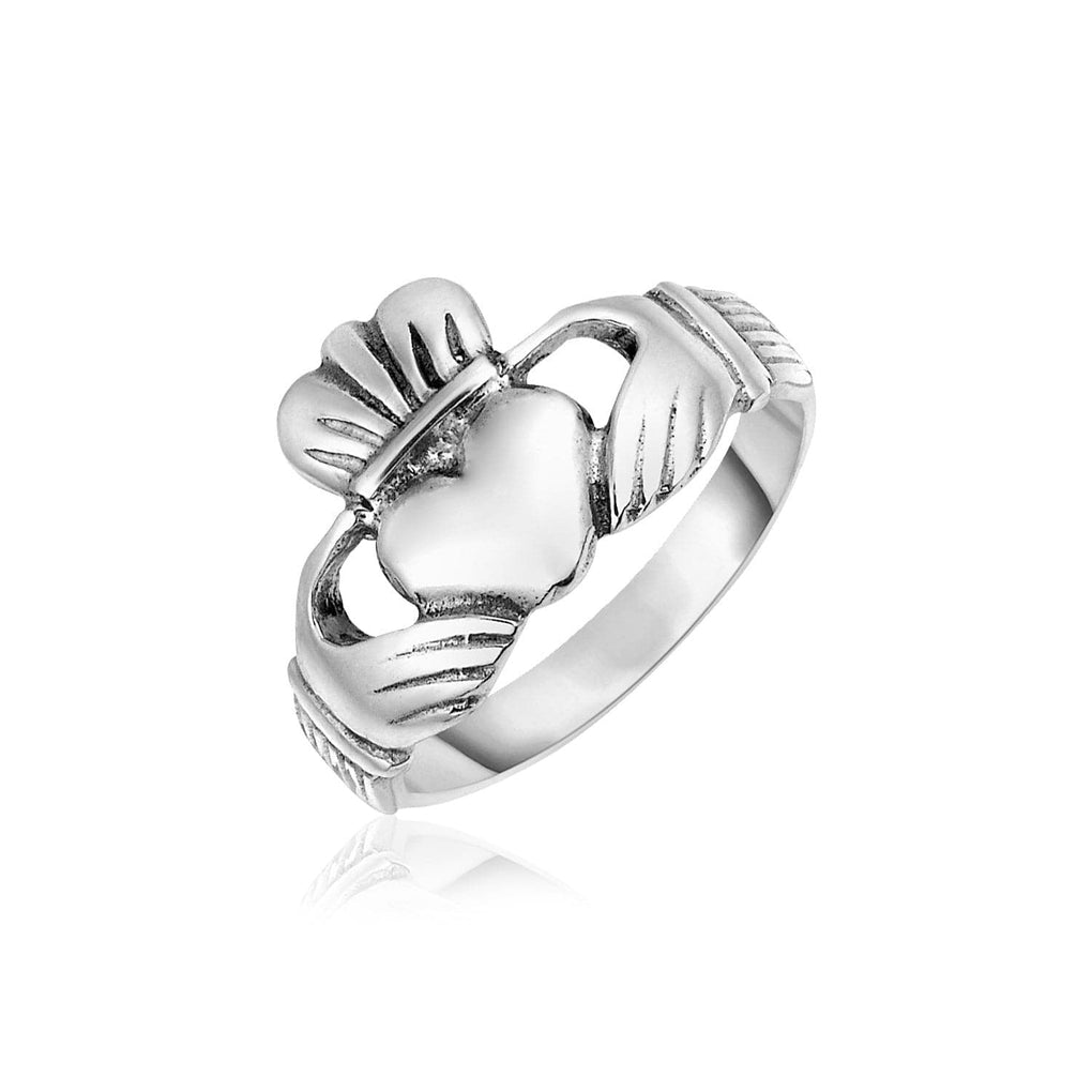 Brightly polished sterling silver complements the traditional Claddagh motifs in this lovely ring. Ring sizes 5 to 9.