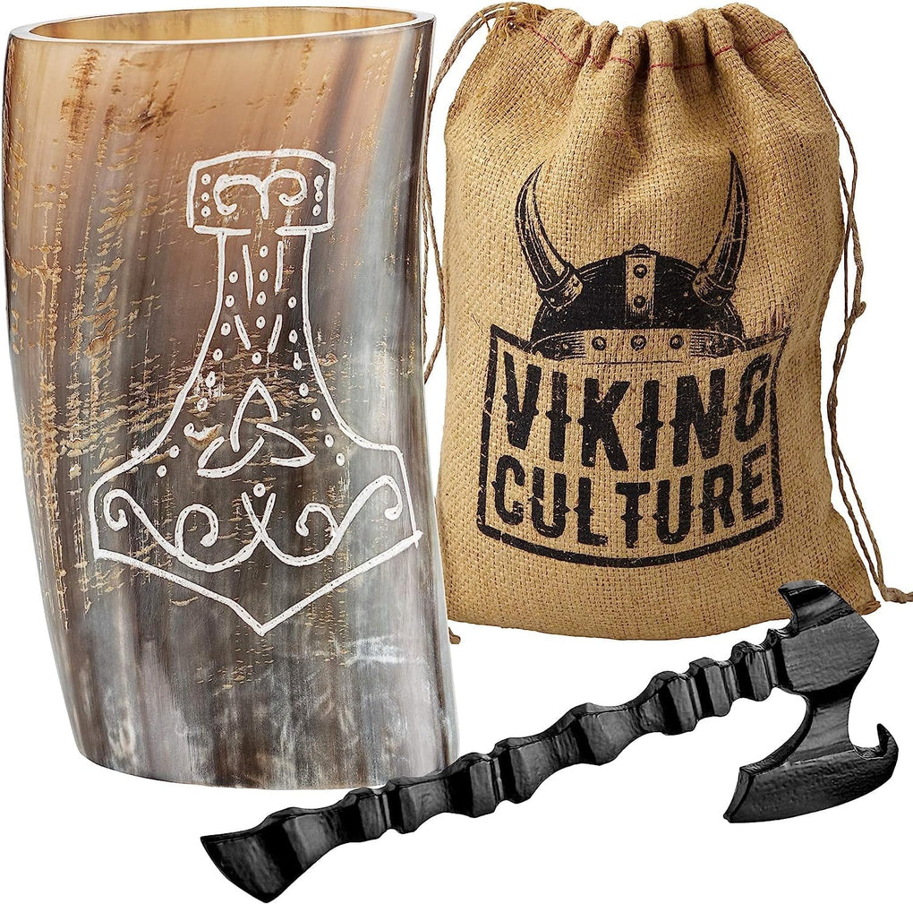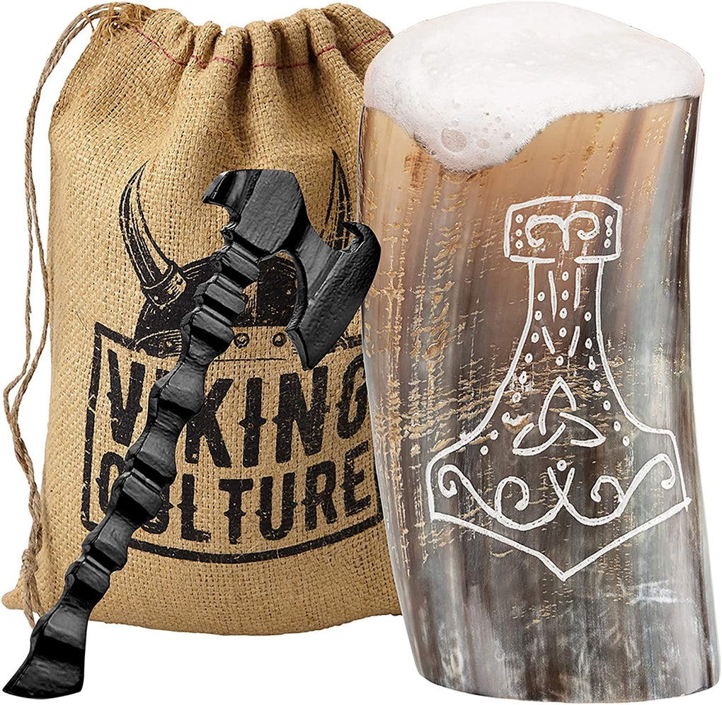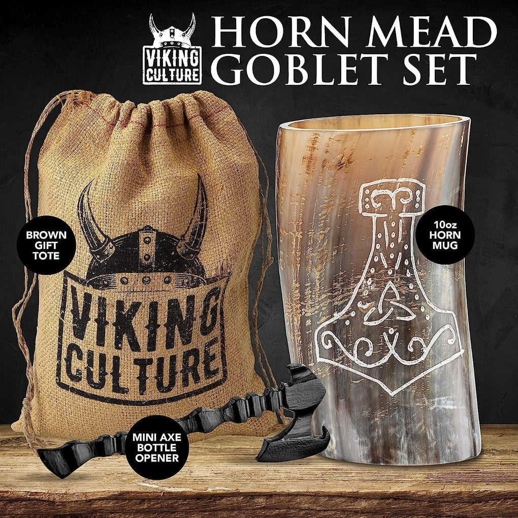 Viking Culture Horn Mead Cup - Nordic Inspired Drinking Vessel | Handmade Goblet for Wine Beer Ale - Safe and Unique Drink Tumbler Gift with Axe Bottle Opener and Burlap Bag