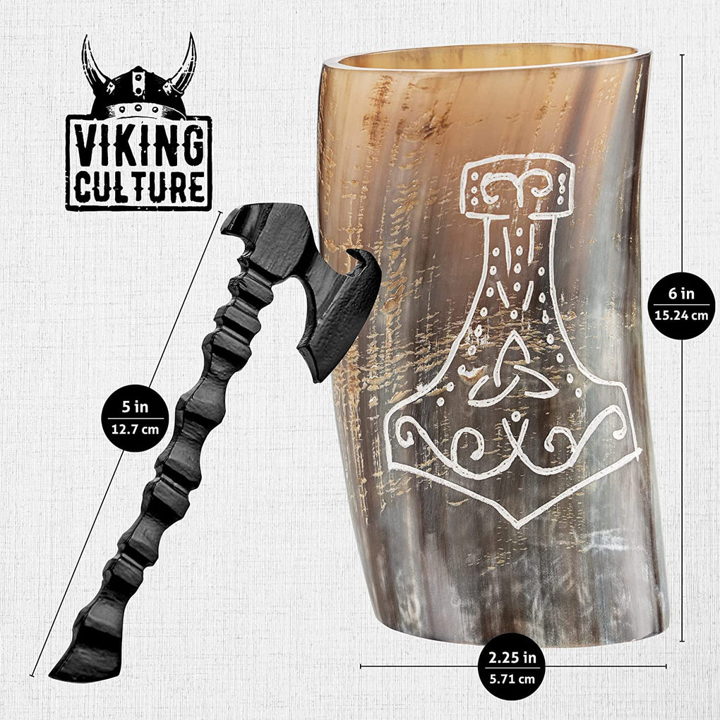 A FANTASTIC GIFT - Our beautiful mead drinking horn cup and steel Axe bottle opener set is a lovely present for loved ones, especially those who adore Nordic culture. Let them celebrate like Vikings every single day.